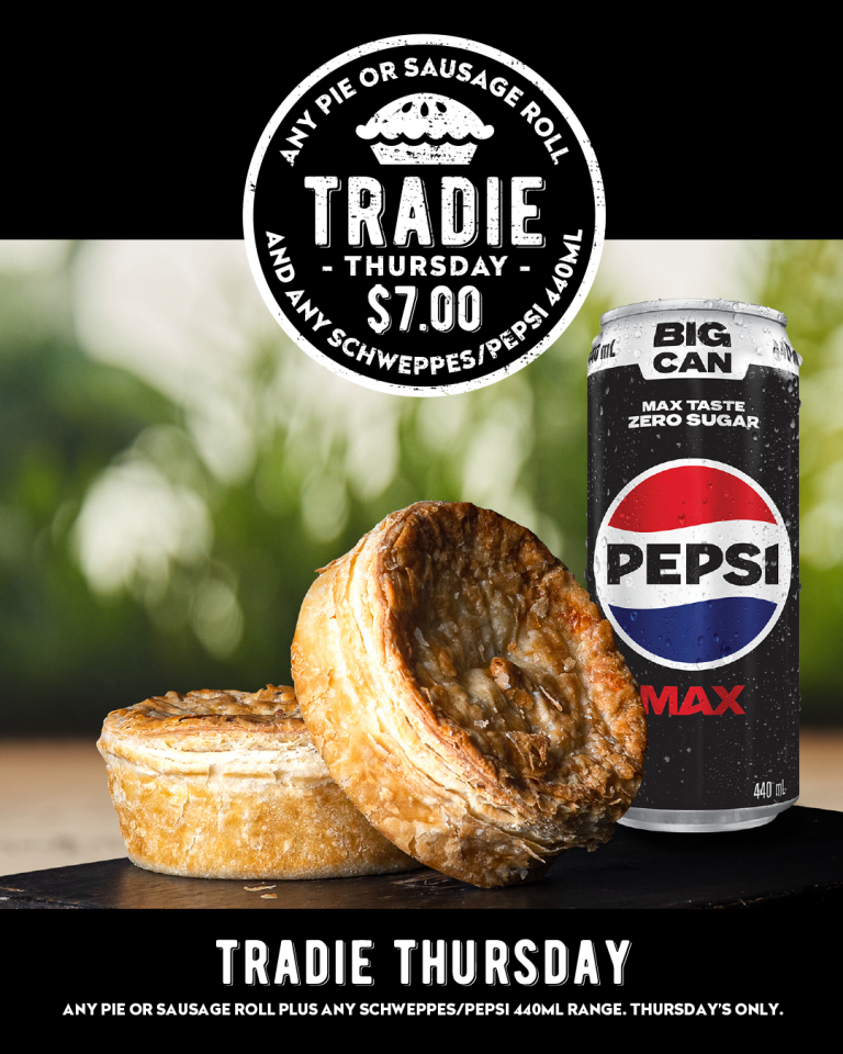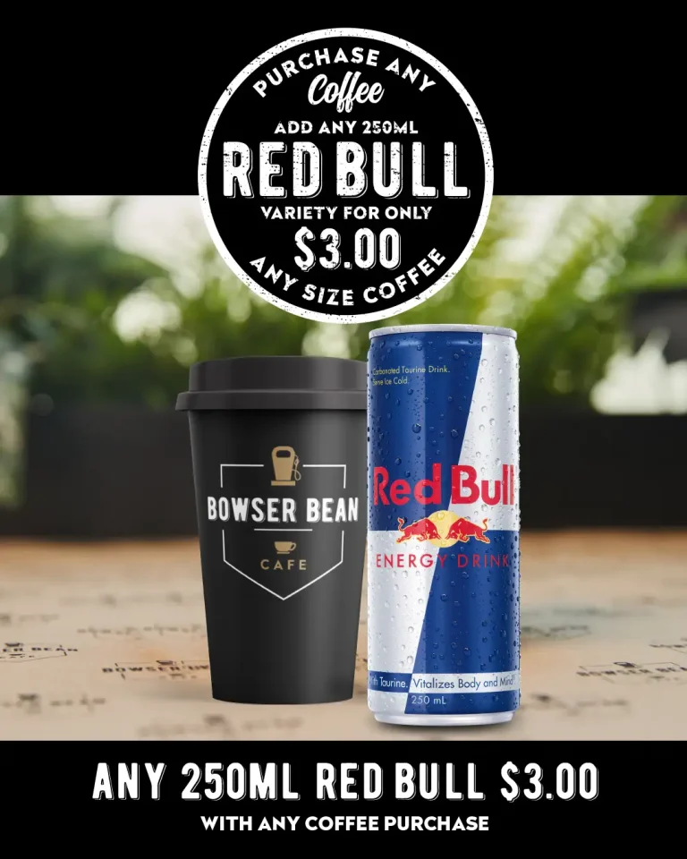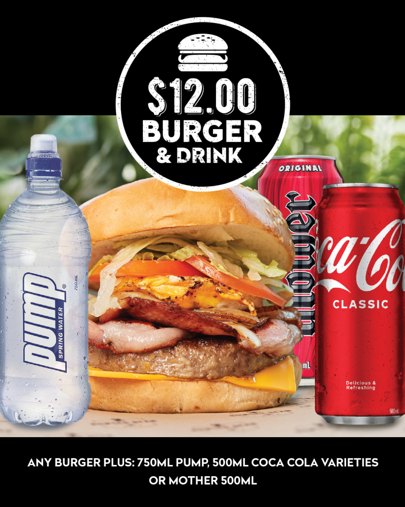Grab a delicious Bowser Bean Burger and wash it down with a cold drink for just $12. Drink choice of Mother Energy 500mL, Pump 750mL or Coke 500mL.