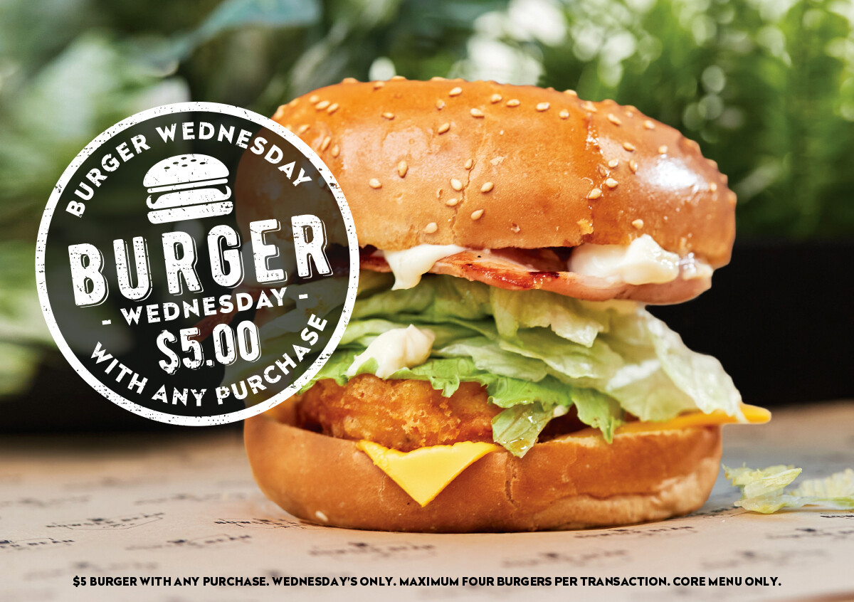 Available Wednesdays only. $5 Burger applies to Core Menu Burgers only – no changes or special request. Offer available only with a purchase. Maximum of 4 burgers per transaction. Any alterations will incur a fee. Offer excludes any Limited Time or Premium Burgers. Offer not available at Castlemaine, Lismore & Seymour.